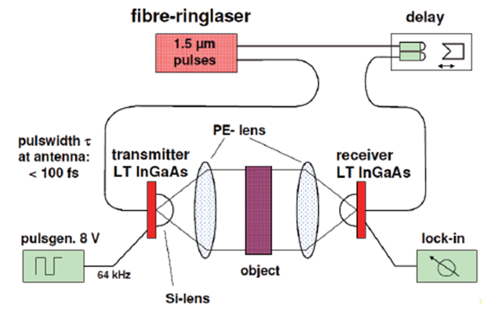 為了得到材料的復數頻率響應,通常會利用超短脈沖泵浦激光的非線性過程產生一個特定頻率范圍的太赫茲脈沖。太赫茲脈沖會在樣品中透射以及被反射。隨后,太赫茲波通過基于非線性技術的電光采樣或者光電導天線利用超短探測脈沖進行采集,這樣就能將太赫茲波的瞬時電場記錄下來。探測光與太赫茲脈沖之間的時延使得采集到的數據可以用來重構完整的太赫茲波形中電磁場的幅度以及相位。與其他超快光學技術例如泵浦-探測光譜類似的是,其時間分辨率取決于探測光脈沖的寬度而并非光電探測器或者測量電路的帶寬。 這就意味著太赫茲時域光譜可以觀測到一個太赫茲脈沖周期內的波形變化。