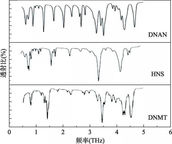 下面展示了甲醚(DNAN)、六硝基芪(HNS)和二硝基亞甲基-四唑(DNMT)這三種粉末的太赫茲透射光譜。